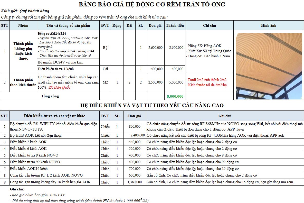 BẢNG BÁO GIÁ HỆ ĐỘNG CƠ RÈM TRẦN TỔ ONG