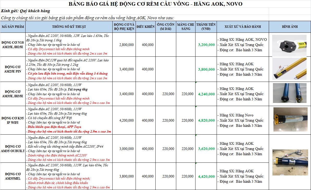 Công ty chúng tôi xin gửi bảng giá sản phẩm động cơ rèm cầu vồng tự động hãng AOK, Novo, Dooya như sau: