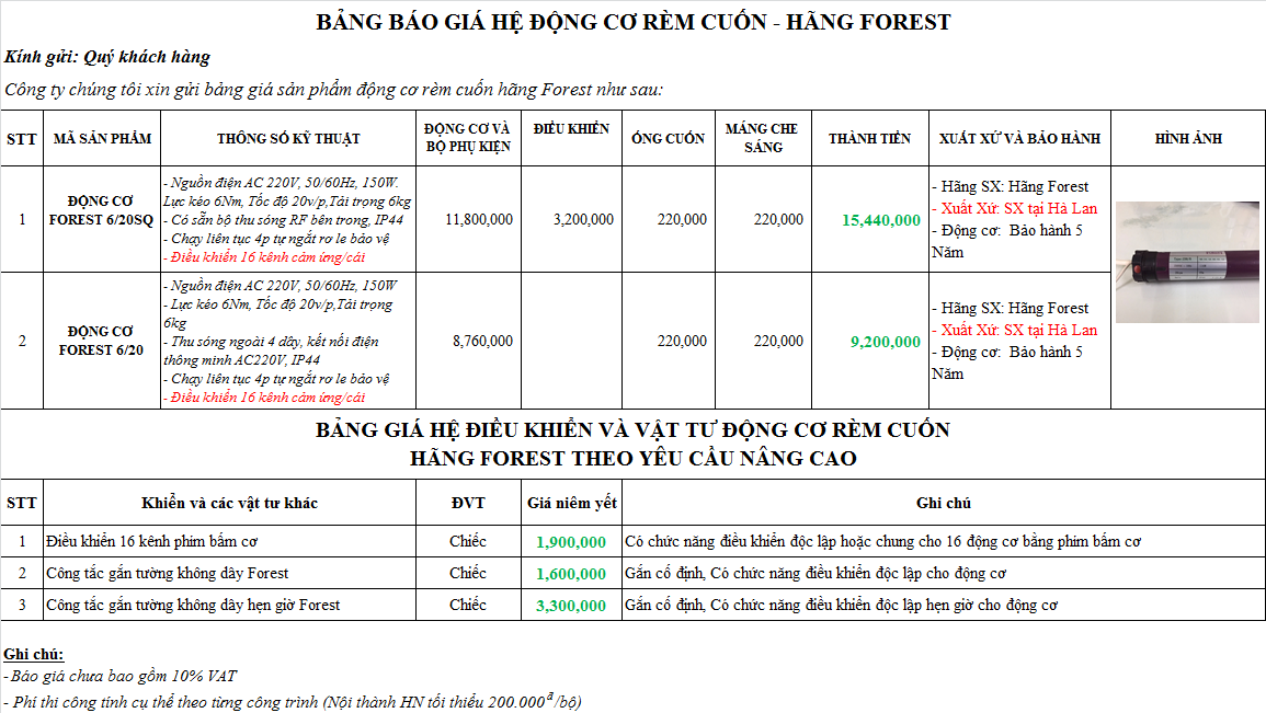 Công ty chúng tôi xin gửi bảng giá sản phẩm động cơ rèm cuốn tự động hãng FOREST như sau: