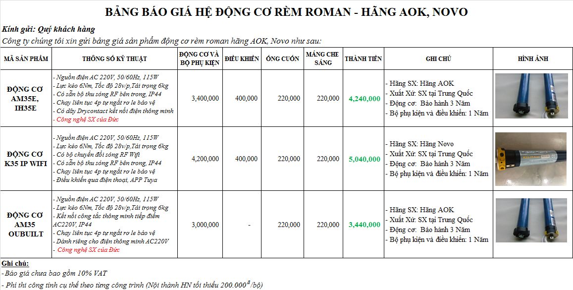 Công ty chúng tôi xin gửi bảng giá sản phẩm động cơ rèm ROMAN tự động hãng AOK, NOVO như sau: