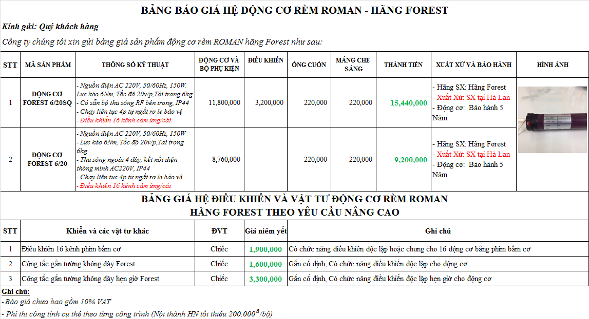 Công ty chúng tôi xin gửi bảng giá sản phẩm động cơ rèm ROMAN tự động hãng FOREST như sau: