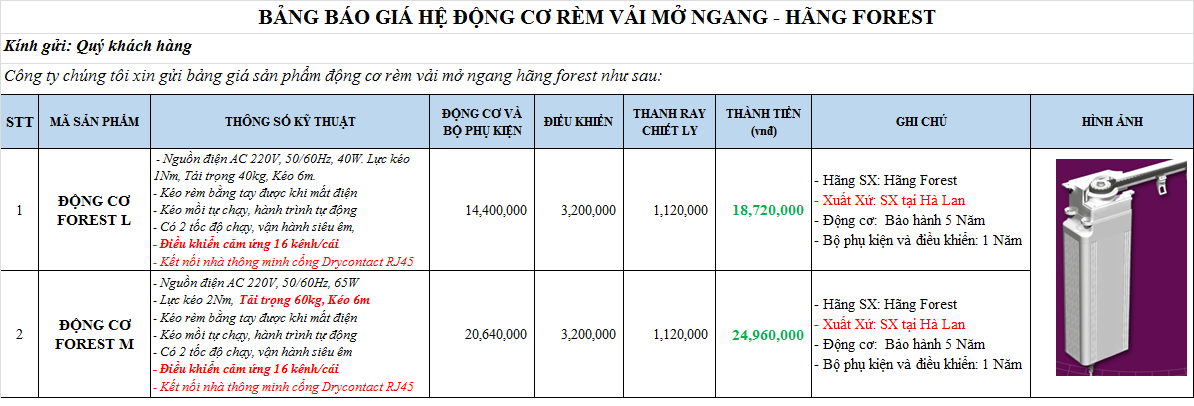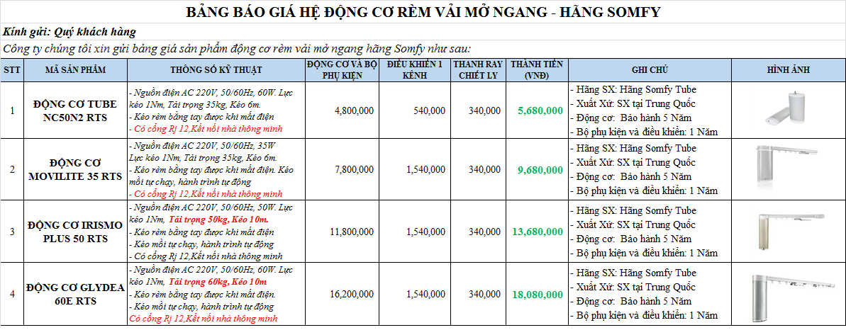 Công ty chúng tôi xin gửi bảng giá sản phẩm động cơ rèm vải mở ngang hãng Somfy, Forest như sau: